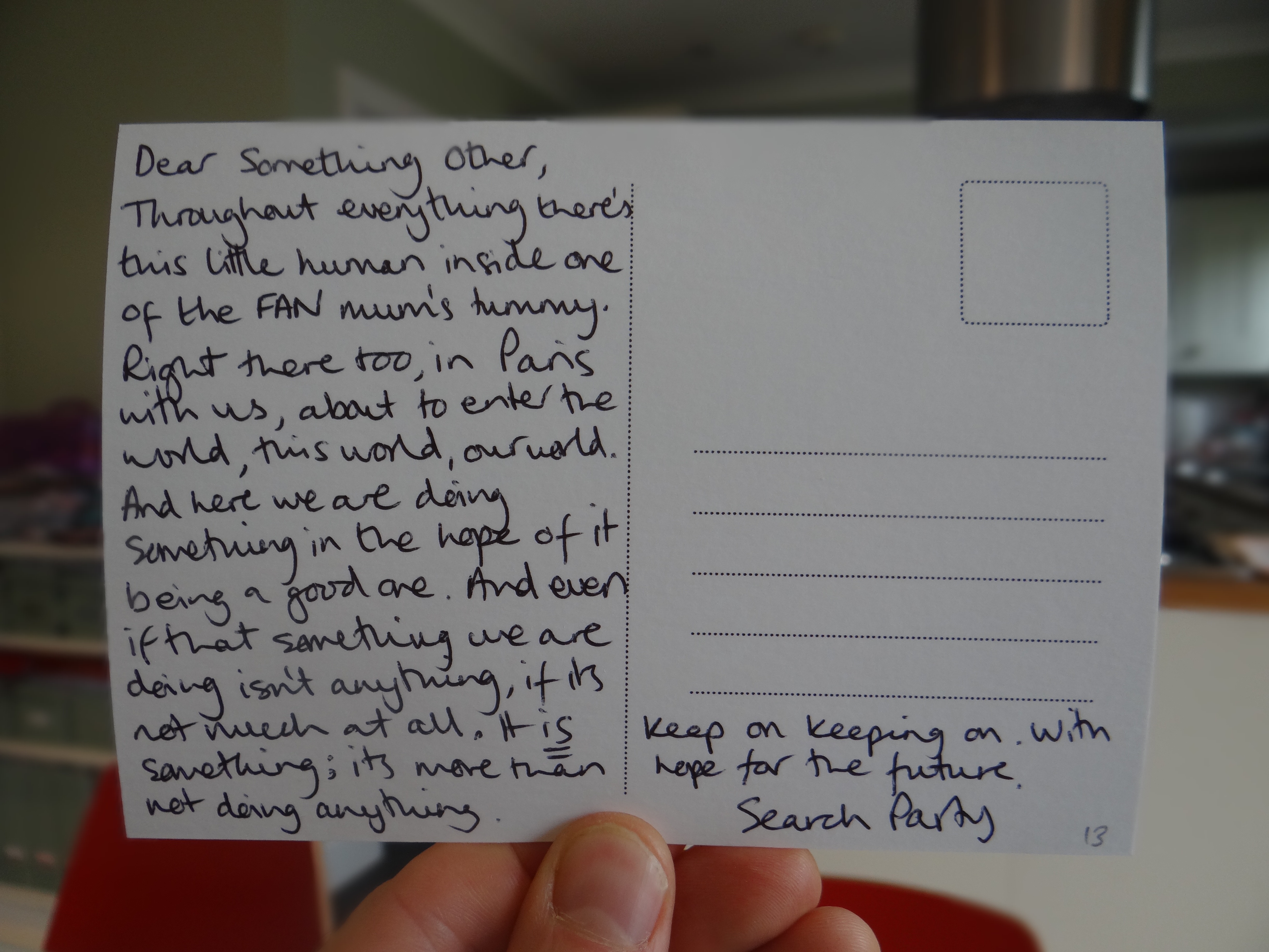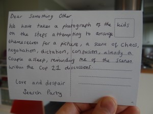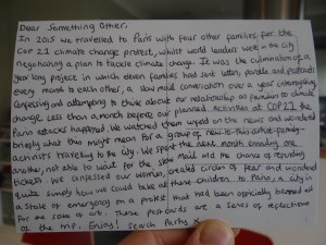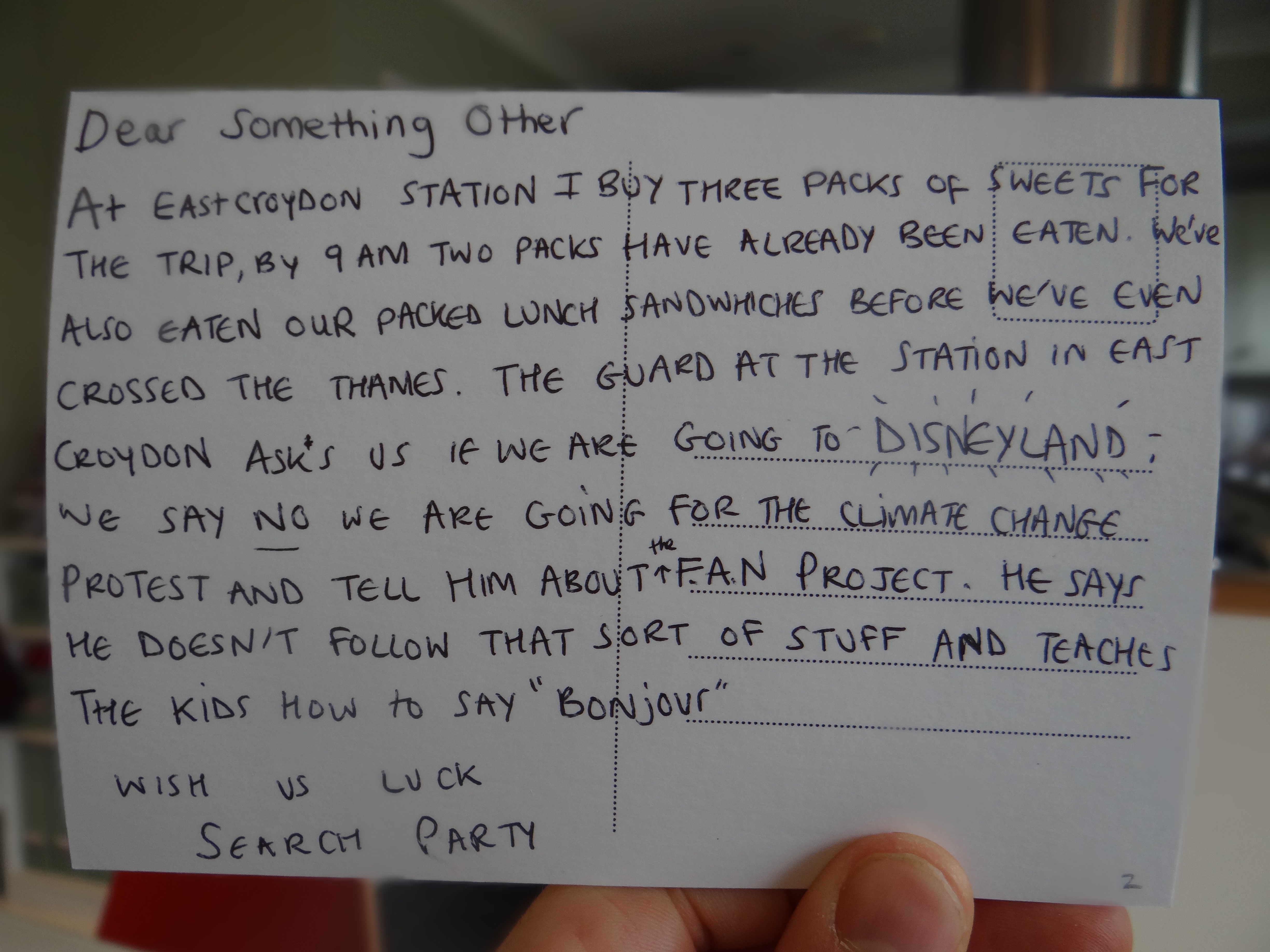 (FAN) is a group of some 35 adults and children, based across the UK (Cambridge, Chichester, Edinburgh, Lincoln, Liverpool, London, Norwich and Sheffield). FAN was formed to consider family life and climate change through a variety of art activist formats. Since its formation in 2014 FAN have exchanged slow mail correspondence, created a reading group This Changes Everything (Naomi Klein 2015), held recruitment events (Two Degrees festival, Artsadmin, London 2015), protested together (Time to Act, London, 2015; D12 Redlines in Paris for COP21, 2015), engaged in creating family performances showcase (Plas Caerdeon, Wales 2016), commissioned a science lecture about James Watt and the onset of Anthropocene Epoch (Glasgow Green, 2016), engaged in a themed discussion on Future Scenarios (2016), created Photo Books of FAN encounters (2015 – ongoing) and debated on FAN email list (2015 – ongoing).