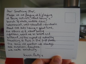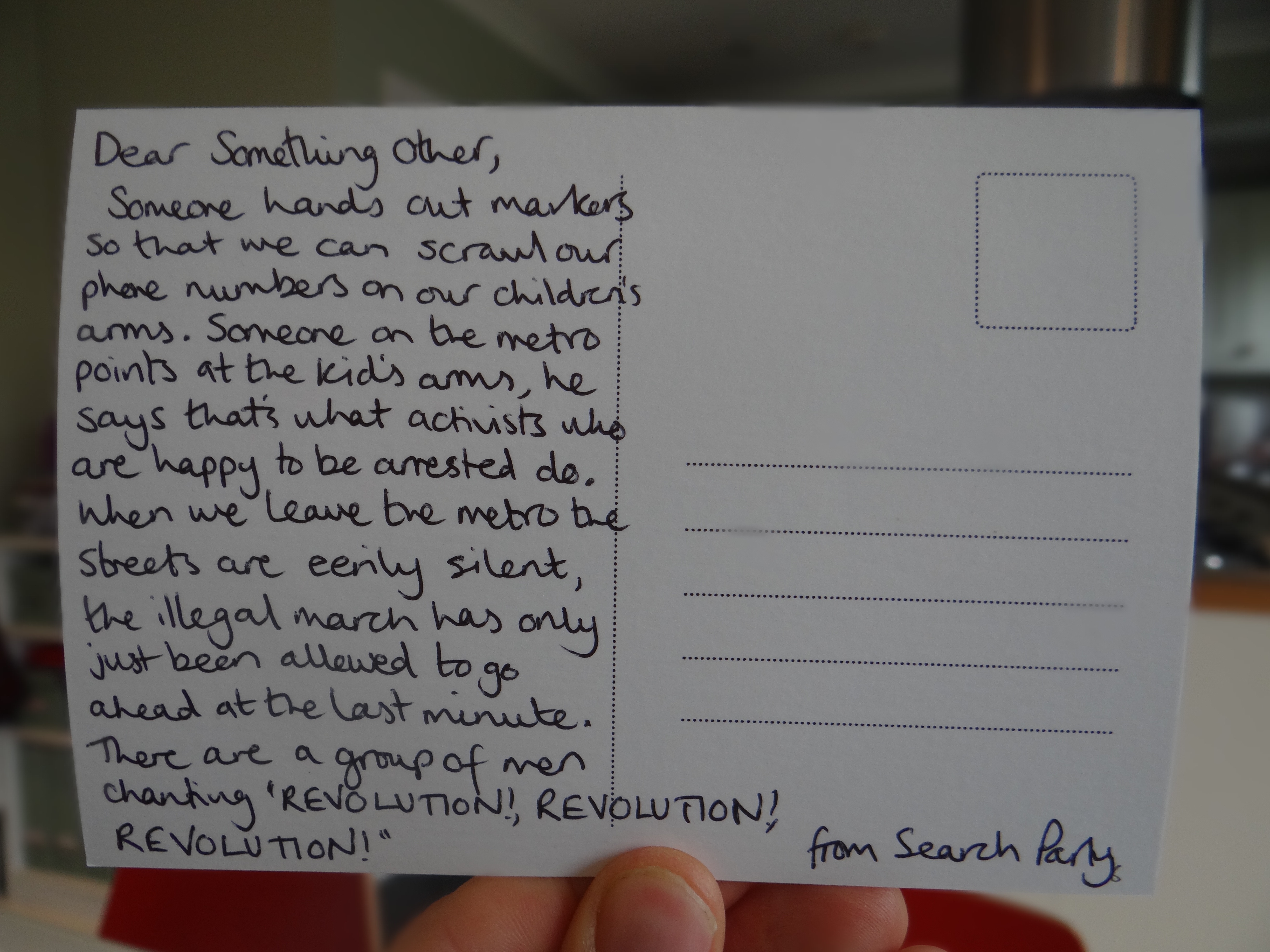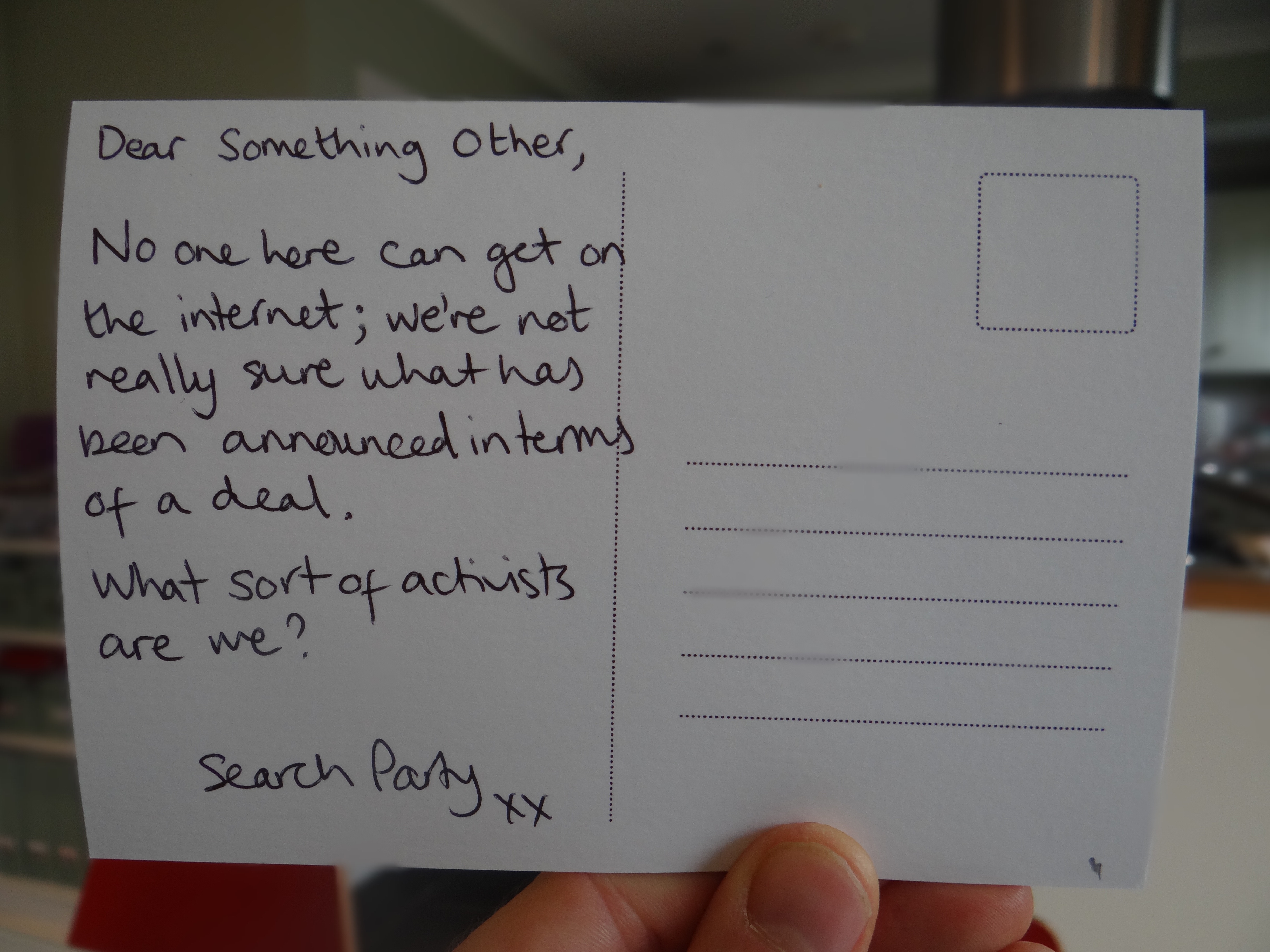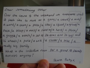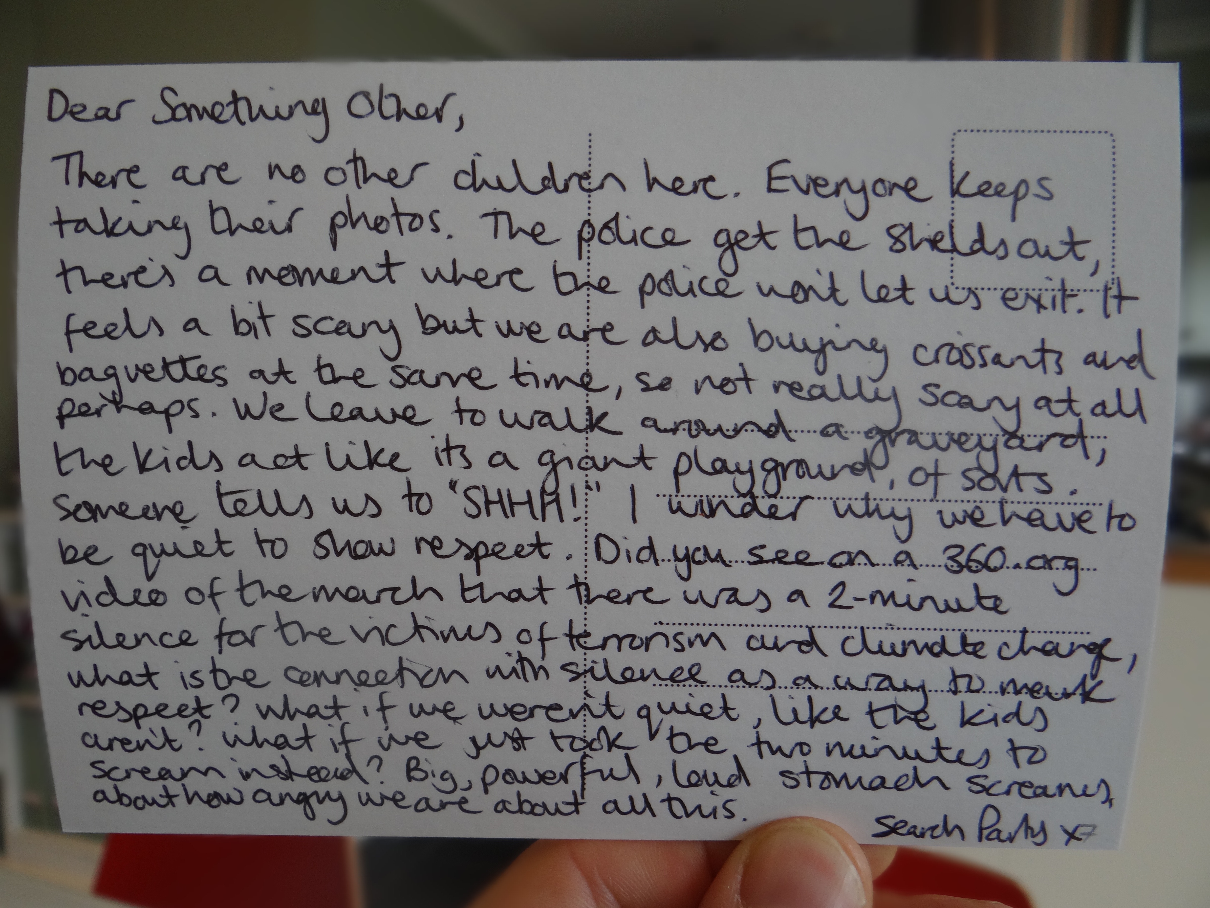 (FAN) is a group of some 35 adults and children, based across the UK (Cambridge, Chichester, Edinburgh, Lincoln, Liverpool, London, Norwich and Sheffield). FAN was formed to consider family life and climate change through a variety of art activist formats. Since its formation in 2014 FAN have exchanged slow mail correspondence, created a reading group This Changes Everything (Naomi Klein 2015), held recruitment events (Two Degrees festival, Artsadmin, London 2015), protested together (Time to Act, London, 2015; D12 Redlines in Paris for COP21, 2015), engaged in creating family performances showcase (Plas Caerdeon, Wales 2016), commissioned a science lecture about James Watt and the onset of Anthropocene Epoch (Glasgow Green, 2016), engaged in a themed discussion on Future Scenarios (2016), created Photo Books of FAN encounters (2015 – ongoing) and debated on FAN email list (2015 – ongoing).