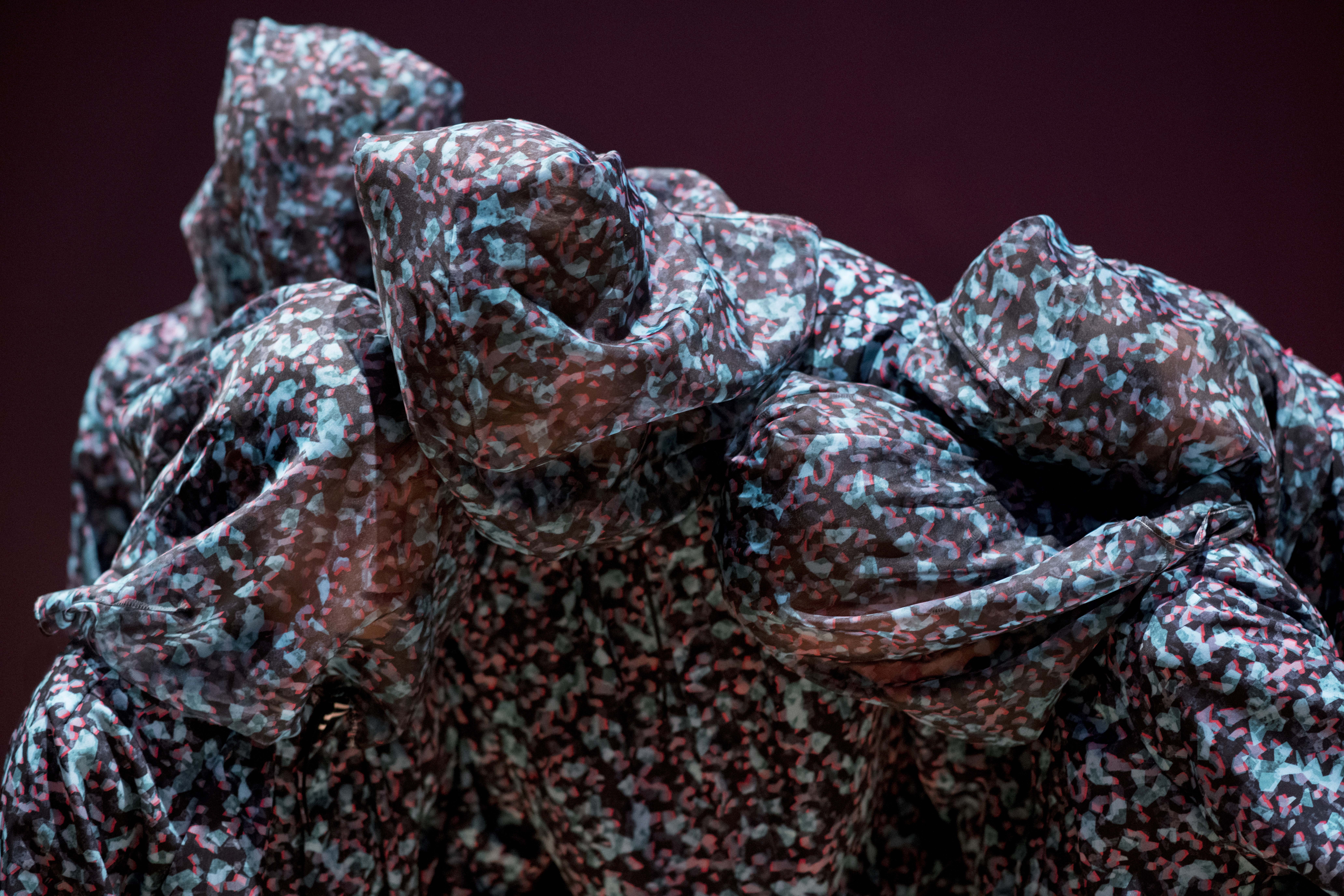Rob Clark’s Mass begins with a separation: the audience split into random groups, led in turn to a rail of gauzy costumes, long floating shirts with a capacious hood attached, that you pull over your face before entering the performance space, rendering each of you strangers, isolated in a crowd. The room through the gossamer fabric blurs; indistinct bodies loom and fade, and there is no way of knowing who is officially performing here and who is audience (or, as someone pointed out in the post-show discussion, who is being paid and has paid), until one of the bodies holds out a light, illuminating their own palm, or the air just before them. Even then, there is no knowing who this person is: their gender, age, skin. Just a body, inviting your body, to step closer, and see what happens.