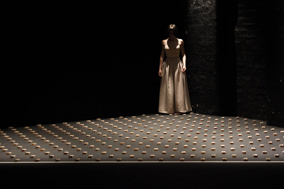 What draws me to this performance is an image of an earlier work. The performer is wearing a white dress, standing at the corner of a room facing outward. She is surrounded by many hundreds of small objects, meticulously arranged into rows on the black floor. The objects are mousetraps. The performer is barefoot. The photograph documents the completion of a durational performance, seven hours total, which I could not attend. And so, over the course of two years, I sometimes recall this image from Present Tense, by Adam York Gregory and Gillian Jane Lees, like an article of faith.
