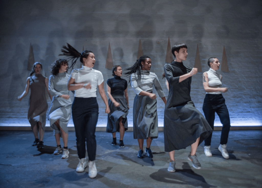 In an alleyway adjacent to the street the performers stand in formation. Dotted around their feet are a number of small cardboard boxes. Over the course of this sequence, the boxes are set afire. Just as the sound of breath carries across lanes of traffic to my ears, the smoke carries to sting my eyes. The gentle irritation of the smoke makes me readjust my gaze, conditioning the quality of attention I bring to the whole of the work. As I look, I recognise the violence of identification; a violence which this collective body — a multiplicity of female (or femme) identities, experiences and political positions — resists. I may recognise the performers as women, predominantly European; I cannot assume that they are heterosexual, cisgender. In their multiplicity, they do not claim to stand in for, or speak up for, any others. Through the choreography, which is impersonal, we sense something unseen, to which it is impossible to remain indifferent. It strains against the architecture of the theatre, and slows the pedestrian movement of the thoroughfare. What we sense is the expansiveness of the desire which animates, and activates, a collective aesthetics, which seems to refuse the containment of the choreography itself.