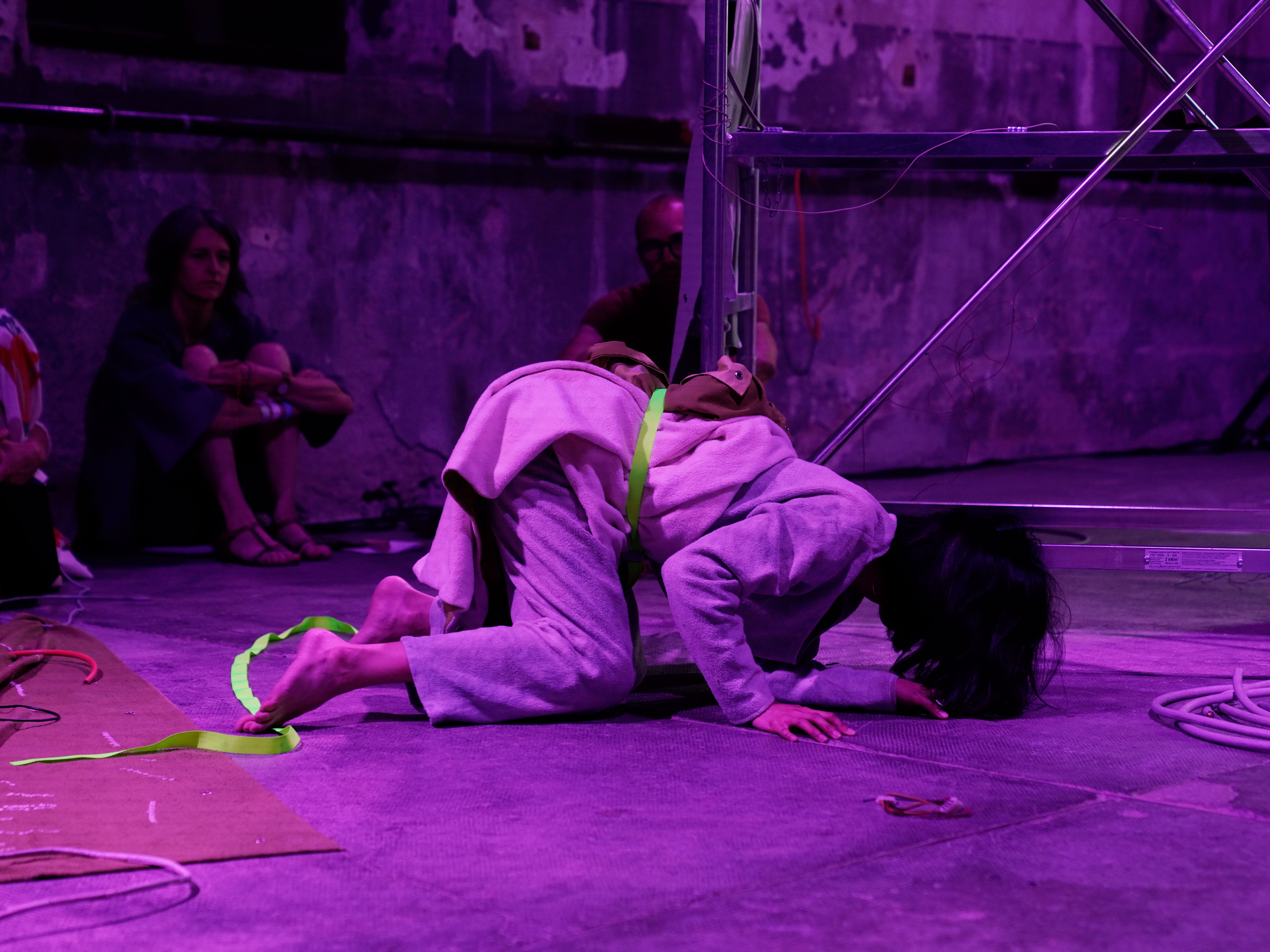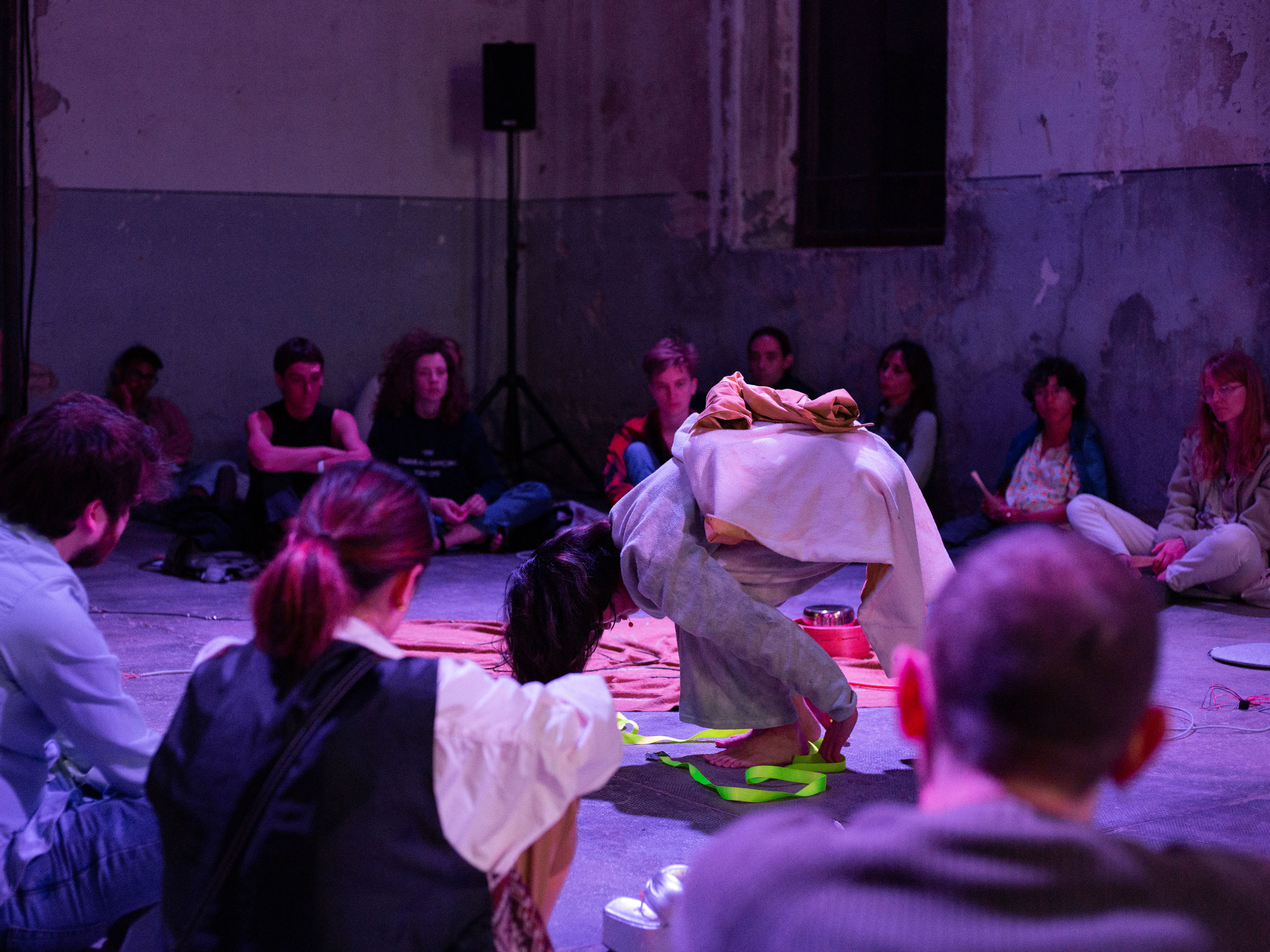 Moving slowly across the terrain, a creature carries other creatures hidden in plain sight, on the surface yet equally at the centre of a network of unseen communions. In contrast to the fluttering fans of the attendees trying to escape the hot Italian summer, Yoojin Lee’s movements are slow, careful. As she moves, she collects and redistributes discarded materials, sometimes tying them to her body and travelling with them across the room. There is something ritualistic taking place. Over layers of sound, a voice intones “v-ve hide / but do not escape / v-ve are here / v-ve rise from excretion / tenderly.” Innumerable microbial happenings are taking place as these words are spoken. Unnamed performers photosynthesise, drawing in light and giving off oxygen. In a seemingly dilapidated space, a flourishing habitat is being created.